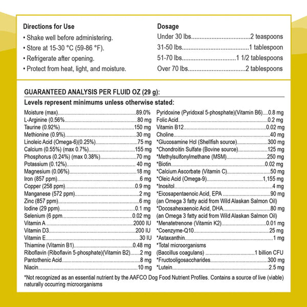 Water (Reverse Osmosis), Sunflower Oil, Salmon Oil, Molasses, Gum Arabic, Sunflower Lecithin, Glucosamine Hcl, Fructooligosaccharides, Methylsulfonylmethane, Citric Acid, Tricalcium Phosphate, Chondroitin Sodium Sulfate, Taurine, Apple Cider Vinegar, Kelp Extract, L-Arginine, Calcium Ascorbate, Potassium Citrate, Choline Bitartrate, Natural Bacon Flavor, Di-Methionine, Sodium Benzoate (A Preservative), Potassium Sorbate (A Preservative), Coenzyme Q10, Vitamin E Supplement, Magnesium Citrate, Xanthan Gum, Organic Alfalfa, Organic Wheatgrass, Organic Wheat Sprouts Malt Dehydrated, Organic Lemon, Organic Barley Sprouts Malt Dehydrated, Organic Chlorella, Niacinamide, Dried Bacillus Coagulans Spore Fermentation Product, Aloe Vera Gel Concentrate, D-Calcium Pantothenate, Ferrous Glycine Complex, Zinc Gluconate, Inositol, Marigold Extract (Tagetes Erecta), Riboflavin, Manganese Glycine Complex, Astaxanthin, Thiamine Hydrochloride, Pyridoxal-5 Phosphate, Copper Gluconate, Vitamin A Supplement, Folic Acid, Potassium Iodide, Vitamin B-12 Supplement, Selenium Glycinate Complex, Biotin, Mixed Tocopherols (A Preservative), Vitamin D Supplement.