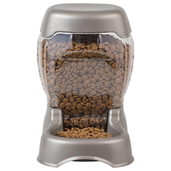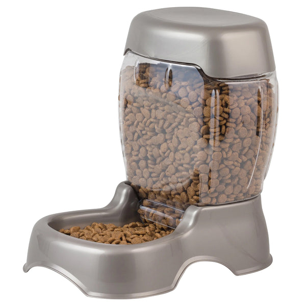- Petmate Café Gravity Pet Feeder for Cats and Dogs Dry Food Treat Dispenser Station, 6-12lb, Pearl - Automatically replenishes the food reservoir when levels get low
