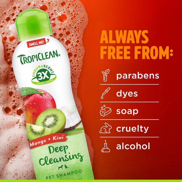 Say goodbye to pesky pet odors TropiClean EnduraScent Mango Kiwi Scented Dog & Cat Shampoo! Combatting smells at their source, this four-in-one shampoo cleans, moisturizes, conditions and strengthens fur. Plus, the innovative EnduraScent technology evenly distributes fresh scents at a molecular level, lasting up to three times longer than the leading brand. This means more cuddle time with your fur baby and less time worrying about unpleasant smells. Plus, the formula is derived from natural ingredients and free from harmful chemicals like phthalates, soap, parabens, silicone, and dyes. As pet parents, you can feel good about using this cruelty-free shampoo on your beloved furry friends.