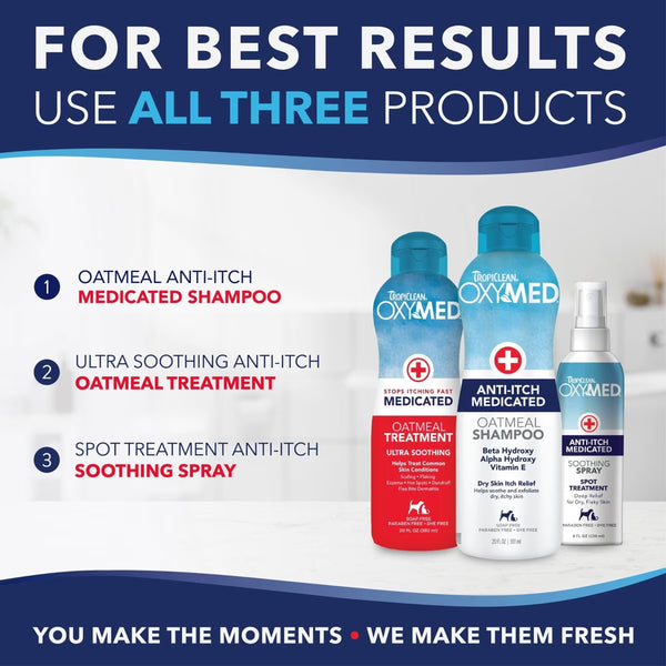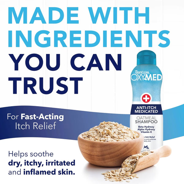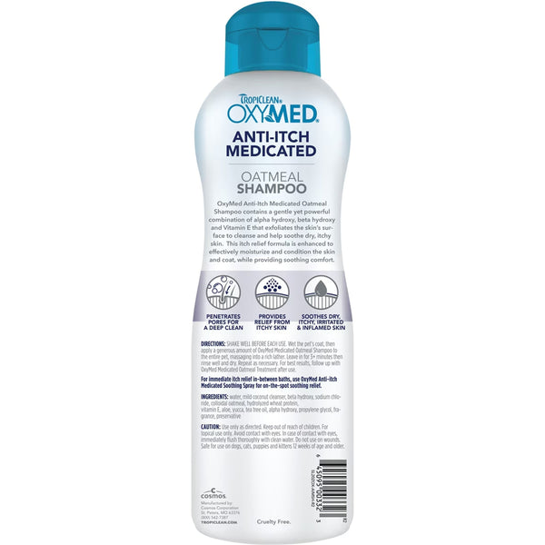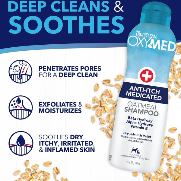 Is your furbaby constantly scratching? For fast-acting, soothing relief, try TropiClean OxyMed Medicated Anti-Itch Dog & Cat Shampoo. This vet-recommended formula goes beyond basic shampoos to provide a supportive, skin-healing clean. Alpha and beta hydroxy acids gently exfoliate the skin. They also penetrate deep inside the skin to alleviate itch and inflammation. OxyMed Medicated shampoo offers a safe and effective solution for dogs and cats dealing with hot spots, eczema, or general skin discomfort. Plus, it’s safe for sensitive skin and contains no soaps, parabens, or dyes. Whether your furry friend struggles with seasonal allergies or ongoing irritations, TropiClean is here to help. For comprehensive support, follow up with TropiClean OxyMed Medicated Itch Relief Dog & Cat Conditioner Treatment (sold separately).