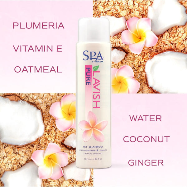 Lavish your pet in pure luxury with SPA by TropiClean Lavish Pure Shampoo for Pets. This tearless and hypoallergenic shampoo provides mild but thorough cleansing. The oatmeal-enriched, soap-free formula is designed leave your pet’s skin healthy and his coat soft, silky, and clean. Ideal for pets with sensitive skin or allergies and perfect for furry faces, this gentle cleanser also freshens, leaving your pet with a long-lasting floral plumeria scent. This salon-grade pet shampoo is safe for use on dogs and cats 12 weeks and older, and it’s a great way to get your furry friend fresh and clean!